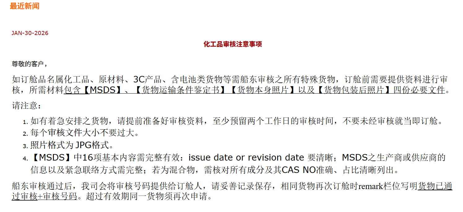 · 后续相同货物再次订舱时,可在订舱备注中注明:“Cargo approved+审核编号”
